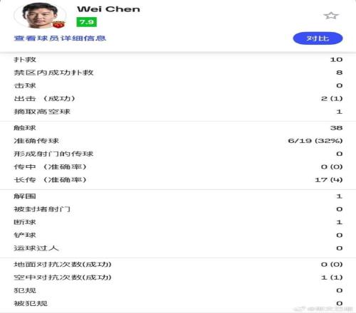 海港隊替補門將陳威此役表現(xiàn)神勇。