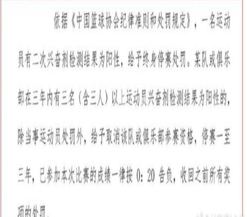 根據(jù)CBA的新規(guī)定,如果球員在2次興奮劑檢測中呈現(xiàn)陽性,將會被終身禁賽。對于球隊(俱樂部),在3年內(nèi)有3名及以上運動員興奮劑檢測為陽性,則取消該球隊(俱樂部)的參賽資格,禁賽期為1-3年,已經(jīng)參加的比賽全部按照0-20判負,并且收回之前所有的獎項。這樣的處罰看起來是非常嚴重的,顯示了CBA總公司和中國籃協(xié)反對興奮劑的決心,也打擊了某些球隊的違規(guī)手段和行為。