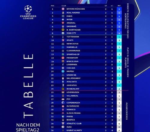 歐冠2輪后積分榜巨變:僅6隊2連勝!2豪門仍0失球,2大前冠軍0分