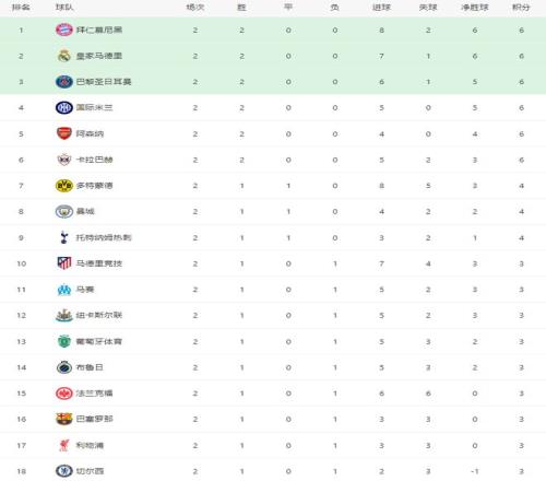 隨著巴黎21絕殺巴薩,曼城22遭絕平,歐冠最新積分榜:拜仁領(lǐng)跑