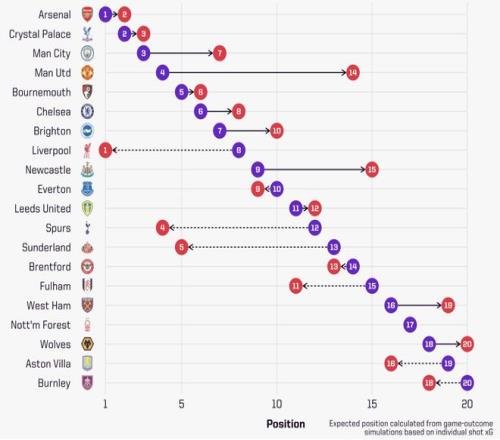 雷速體育10月1日報道宣稱 今日,國外知名數(shù)據(jù)機(jī)構(gòu)公布了一項英超聯(lián)賽前六輪預(yù)期積分排名的數(shù)據(jù)結(jié)論,其中目前位列榜首的利物浦期望排名僅位列第八,而排名第二的阿森納期望排名是英超第一,實際排名第四的熱刺預(yù)期排名僅為英超第12。