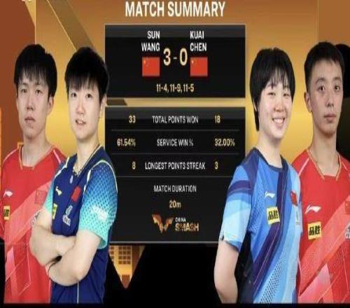 2025年WTT中國大滿貫混雙1/4決賽,王楚欽/孫穎莎以3比0(11比4、11比9、11比5)戰(zhàn)勝隊友陳垣宇/蒯曼,晉級四強。王楚欽/孫穎莎半決賽的對手是巴西組合雨果/高橋·布魯娜。