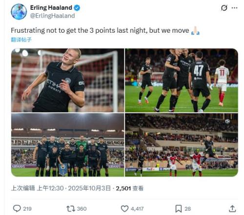 哈蘭德更新社交媒體寫道:“昨晚沒能拿到三分很沮喪,但我們會(huì)繼續(xù)前進(jìn)?!?/p>