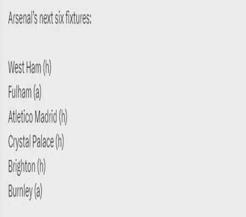 阿森納未來6場比賽:主戰(zhàn)西漢姆、客戰(zhàn)富勒姆、主戰(zhàn)馬競、主戰(zhàn)水晶宮、主戰(zhàn)布萊頓、客戰(zhàn)伯恩利。
