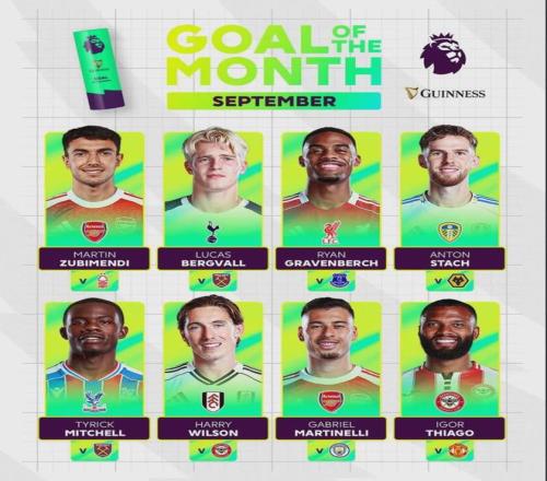 祖比門迪對諾丁漢森林一戰(zhàn)中的凌空破門和馬丁內(nèi)利對曼城比賽中的絕平進球被提名為了英超9月份最佳進球候選。