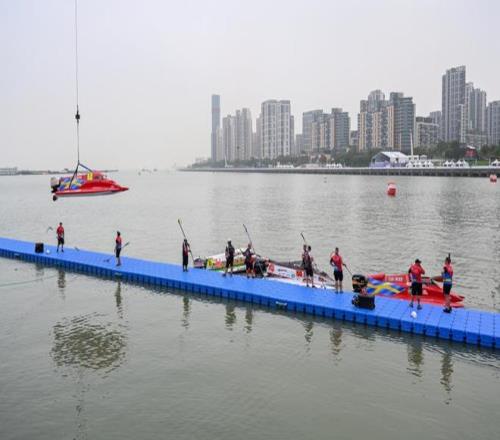 摩托艇被吊入比賽起點(diǎn)處。澎湃新聞記者 朱偉輝 圖