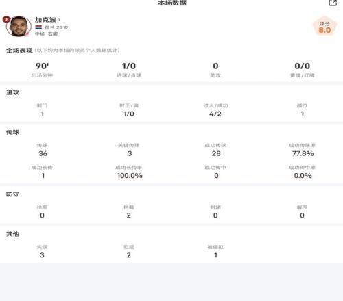 加克波戰(zhàn)切爾西全場數(shù)據(jù):打進1球,傳球成功率77.8%