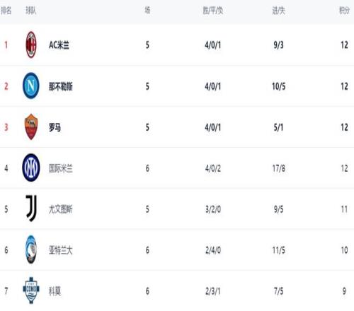 在積分榜上,榜首易主,國際米蘭以12分登上了榜首位置。還有3支球隊也是12分,但凈勝球不如國際米蘭。AC米蘭、那不勒斯和羅馬排名第2到第4,這些球隊都比國際米蘭少踢1輪。尤文圖斯以11分排名第5。亞特蘭大只拿到10個積分,排名第6??颇?、薩索洛和克雷莫內(nèi)塞都是9個積分。而拉齊奧只拿到7分,排名第10。