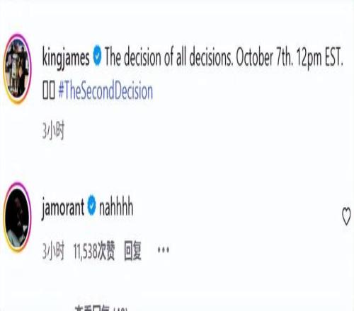 現(xiàn)年40歲的詹姆斯會宣布怎樣的決定?不少人推測和退役有關(guān)?;倚芮蛐悄m特連續(xù)在評論區(qū)里回應,他先是發(fā)了一條“不!”這或許也代表了很多球迷的心聲,不愿意看到詹姆斯宣布退役的一刻。不過隨后,莫蘭特又評論道:“他們說你在騙人?!边@也代表了一些人的猜測,認為這次決定未必就是宣布退役,可能是營銷。