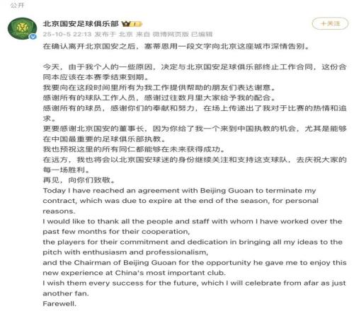 中秋節(jié)前一晚,中國(guó)足壇傳出一條相當(dāng)重磅的消息:正率領(lǐng)北京國(guó)安爭(zhēng)奪中超冠軍的名帥塞蒂恩,辭職了!根據(jù)北京國(guó)安官方渠道發(fā)布的公告,塞帥是因?yàn)椤皞€(gè)人及家庭原因”主動(dòng)掛印而去。不過(guò)明眼人都看得出來(lái),塞蒂恩離開(kāi)國(guó)安帥位,最大的原因還是國(guó)安戰(zhàn)績(jī)的下滑。執(zhí)教過(guò)巴薩,帶過(guò)梅西的教練都不一定帶得動(dòng)球隊(duì),執(zhí)教中超和中國(guó)國(guó)字號(hào)隊(duì)伍的難度,著實(shí)比不少外國(guó)教頭想象中大不少。