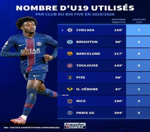 本賽季五大聯(lián)賽U19球員切爾西使用人數(shù)最多,巴黎出場時(shí)間最多