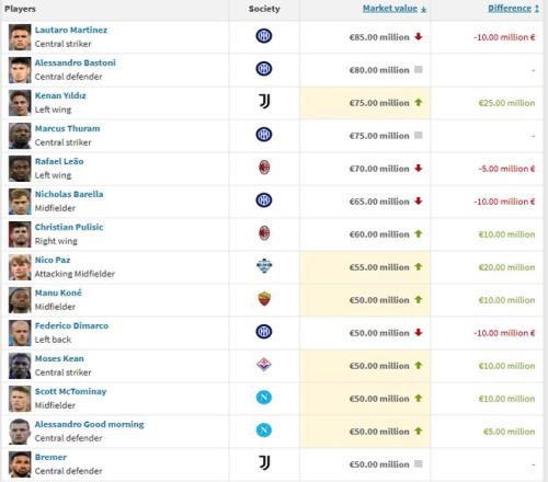 意甲球員德轉(zhuǎn)身價(jià)最新TOP10
