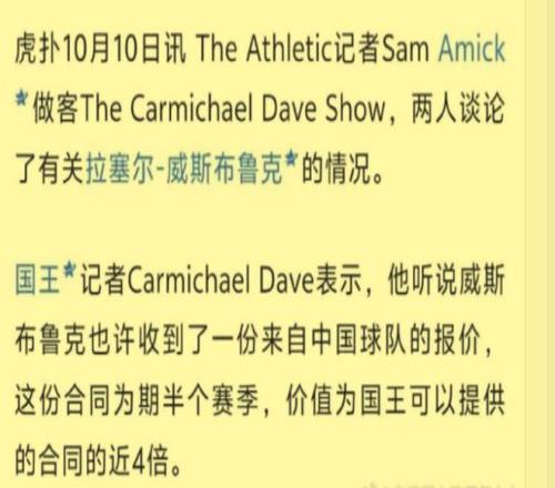 而根據(jù)NBA國(guó)王隊(duì)隨隊(duì)體育記者卡邁克爾-戴夫的最新爆料,他說(shuō)威斯布魯克確定會(huì)來(lái)CBA聯(lián)賽效力,而且那支對(duì)威斯布魯克感興趣的CBA球隊(duì)的報(bào)價(jià)合同,竟然是國(guó)王隊(duì)能給他的年薪的4倍,這也太夸張了吧?