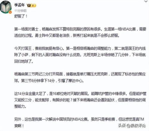 體壇周報(bào)記者孟季年表示:第一場面對勇士,楊瀚森發(fā)揮不算特別亮眼的原因有很多。生涯第一場NBA比賽,需要適應(yīng)的過程。勇士陣中又都是老油條,新秀打起來就是不會那么舒服。