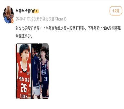 原文寫道:張文杰的夢幻旅程:上半年在加拿大高中校隊(duì)打替補(bǔ),下半年登上NBA季前賽舞臺(tái)完成得分。 ???