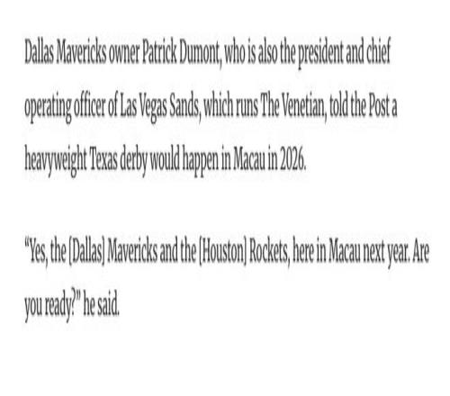 杜蒙特在接受采訪時表示:“明年獨行俠將與火箭在澳門交鋒,你們準(zhǔn)備好了嗎?”