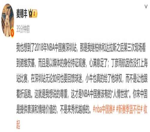 對此,媒體人麥穗豐社媒發(fā)文吐槽,NBA球隊來中國是提供表演和情緒價值的,不是來秀優(yōu)越感的。