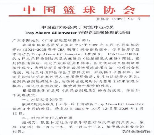 中國(guó)籃協(xié):吉倫沃特興奮劑違規(guī)禁賽3個(gè)月廣東男籃承擔(dān)3萬(wàn)6檢測(cè)費(fèi)