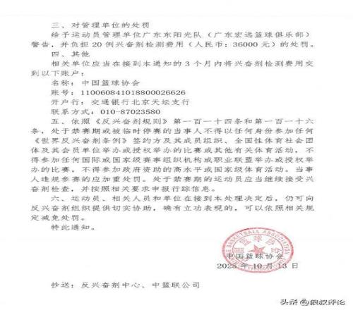 收到陽(yáng)性通知后,運(yùn)動(dòng)員本人提出了書面聽(tīng)證申請(qǐng)。同時(shí),山東高速籃球俱樂(lè)部依照國(guó)家體育總局《體育運(yùn)動(dòng)中興奮劑管制通則》,向中國(guó)籃協(xié)和反興奮劑中心提交了書面情況說(shuō)明和相關(guān)證明材料。