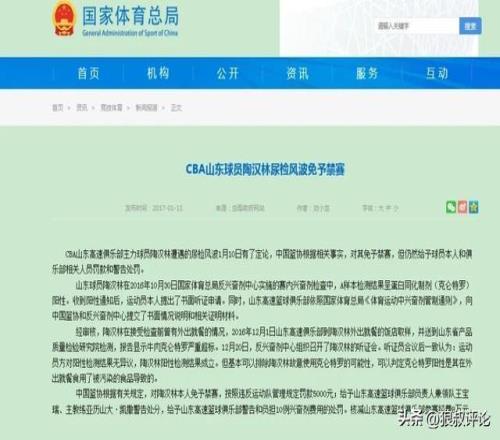 山東球員陶漢林在2016年10月30日國(guó)家體育總局反興奮劑中心實(shí)施的賽內(nèi)興奮劑檢查中,A樣本檢測(cè)結(jié)果呈蛋白同化制劑(克侖特羅)陽(yáng)性。