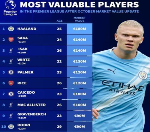英超球員身價榜公布:哈蘭德1.8億斷崖式領(lǐng)先,利物浦成最大贏家