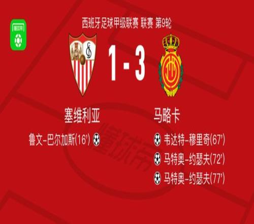北京時(shí)間10月18日西班牙足球甲級(jí)聯(lián)賽 聯(lián)賽 第9輪,塞維利亞主場(chǎng)對(duì)陣馬略卡。塞維利亞魯文-巴爾加斯破門(mén)。馬略卡韋達(dá)特-穆里奇破門(mén),馬特奧-約瑟夫梅開(kāi)二度。最終比分塞維利亞 1-3 馬略卡。