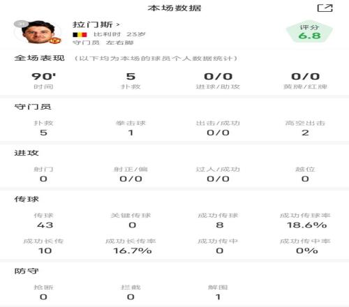 雷速體育10月20日報道宣稱 在今天凌晨結(jié)束的英超雙紅會中,曼聯(lián)門將拉門斯表現(xiàn)出色,幫助曼聯(lián)客場力克衛(wèi)冕冠軍利物浦。
