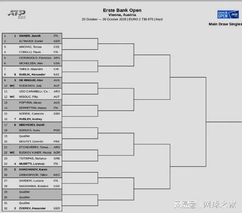 維也納站:辛納、茲維列夫、德米納爾、穆塞蒂位列前四種子。俄羅斯三雄卡恰諾夫、梅德維德夫、盧布列夫也將出戰(zhàn)。