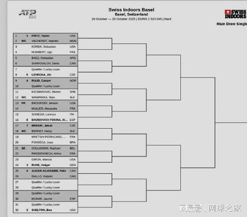 我們再來關(guān)注下周賽事。北京時間昨晚,兩站ATP500和一站W(wǎng)TA500賽相繼公布了正賽簽表。巴塞爾站:弗里茨、謝爾頓、魯?shù)骂I(lǐng)銜出戰(zhàn)。弗里茨首輪將迎戰(zhàn)新科上海大師賽冠軍瓦舍羅。