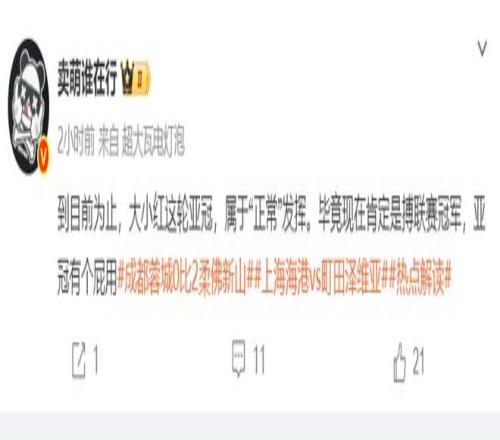 而媒體人“賣萌誰在行”則是在個人社媒這樣寫道:“到目前為止,大小紅這輪亞冠,屬于“正常”發(fā)揮。畢竟現(xiàn)在肯定是搏聯(lián)賽冠軍,亞冠有個P用!”