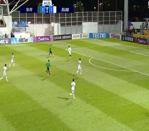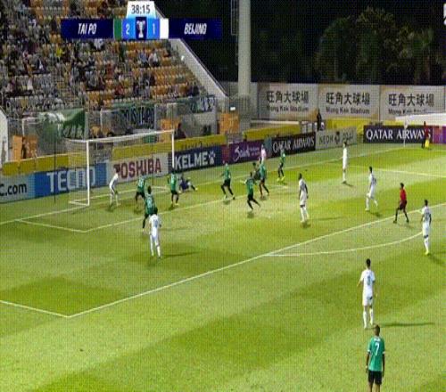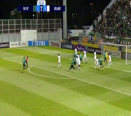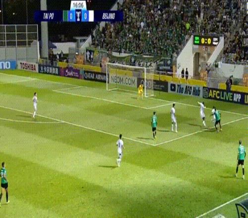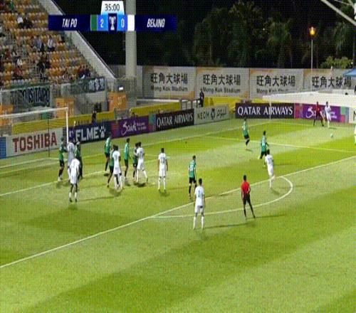 第36分鐘,張稀哲右邊路大腳開到禁區(qū),柏楊甩頭攻門頂進,北京國安扳回1球。