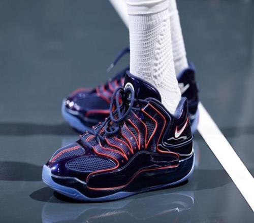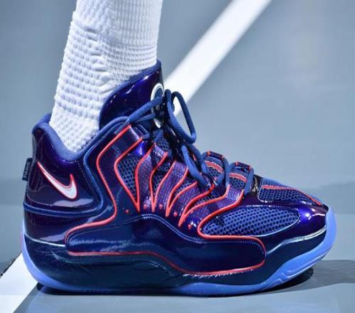 本場比賽,火箭隊球星杜蘭特首次上腳耐克KD 18 PE巴黎圣日耳曼聯(lián)名款球鞋出戰(zhàn)。通過款式可以看到,這款球鞋屬于中幫鞋,以深藍色和紅色作為主要配色,復(fù)刻了巴黎圣日耳曼的球隊主要配色。