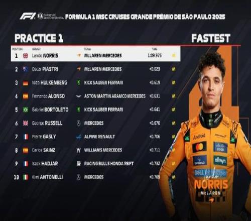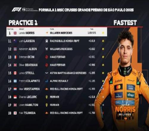 F1巴西站一練:邁凱倫全場最快,維斯塔潘第17,法拉利位列1819