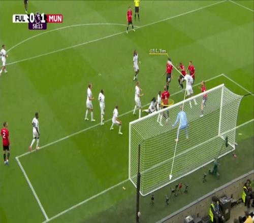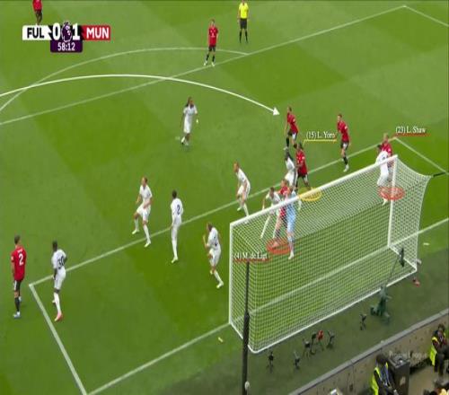 當姆伯莫將內旋角球開向后點時,盧克-肖在那個區(qū)域牽制住了富勒姆的區(qū)域防守球員羅德里戈-穆里斯。相應地,約羅在目標區(qū)域內與巴錫形成一對一。
