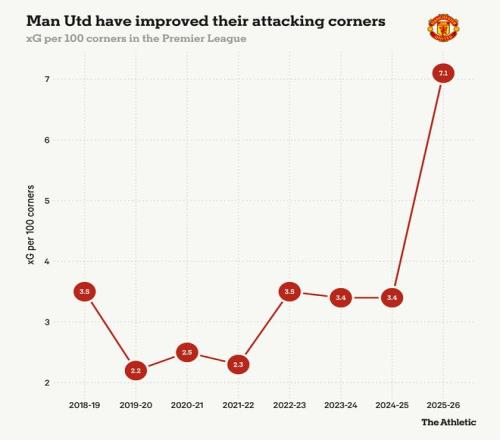 2025-26賽季曼聯(lián)進攻角球的改進得到了底層數據的支持。從球隊每100次角球的xG來看,他們目前7.1的數據是過去七個英超賽季中任意一個賽季的兩倍多。