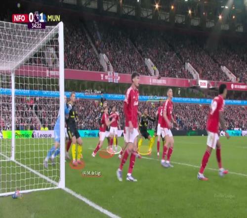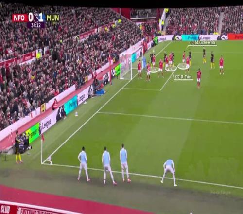 另一個例子來自本月2-2戰(zhàn)平諾丁漢森林的客場比賽。對手采用純粹的區(qū)域防守,內科-威廉斯、耶茨和吉布斯-懷特負責防守后點區(qū)域。