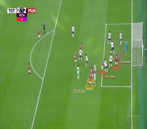 與此同時,芒特阻止了維卡里奧出擊爭搶傳中,而肖則擋住了本坦庫爾——后者是熱刺在后點區(qū)域的一名區(qū)域防守球員。