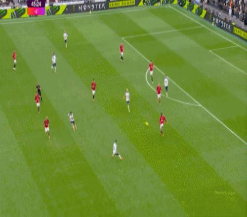 雖然曼聯(lián)在進攻端的布置在理論上稍有問題,庫尼亞和阿瑪德-迪亞洛在各自位置上的表現不足很清晰,導致上半場的反制能力沒能拔到理論上的最高值,但曼聯(lián)還是先進一球,而且線路上恰好是右路的阿瑪德-迪亞洛傳給左路的姆貝烏莫: