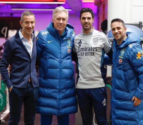 巴西隊(duì)在阿森納基地訓(xùn)練,安切洛蒂與阿爾特塔會(huì)面并合影