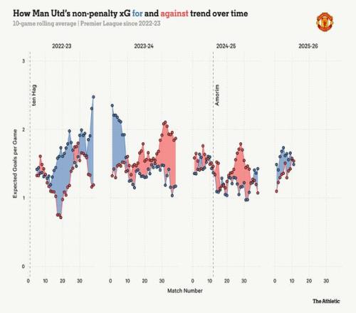 曼聯(lián)的總體方向是向上的,如下面這張詳細顯示球隊隨時間推移的預期進球和預期失球數(shù)據(jù)圖所示。要達到滕哈赫執(zhí)教第一個賽季任期的高點仍有工作要做,但在長期處于導致?lián)Q帥的紅色負值區(qū)域之后,代表正向差異的藍色區(qū)域已變得更加明顯。