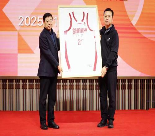 發(fā)布會現(xiàn)場,山西汾酒集團(tuán)黨委書記、董事長袁清茂向山西廣播電視臺黨委書記、臺長劉英魁贈送CBA山西汾酒男籃成立20周年紀(jì)念版戰(zhàn)袍。
