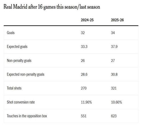 如下表所示,實(shí)際上今年在阿隆索的帶領(lǐng)下,皇馬產(chǎn)生的預(yù)期進(jìn)球值比去年更高,總進(jìn)球和非點(diǎn)球進(jìn)球也更多。但他們的射門轉(zhuǎn)化率卻下降了,盡管在對手禁區(qū)內(nèi)的觸球次數(shù)和射門次數(shù)都比上賽季多。
