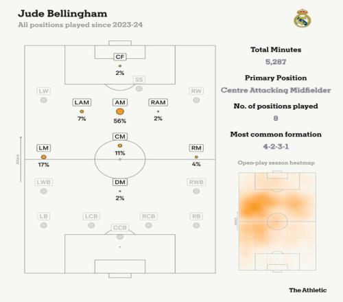 阿隆索在幾次新聞發(fā)布會(huì)上表示,希望他踢中場位置,同時(shí)不失去在對方禁區(qū)的影響力。貝林厄姆則更傾向于踢更靠前的位置,就像他前任教練卡洛·安切洛蒂使用他的方式一樣。下圖顯示了貝林厄姆自2023年加盟皇馬以來主要踢攻擊型中場,同時(shí)在上賽季也出現(xiàn)在左路。