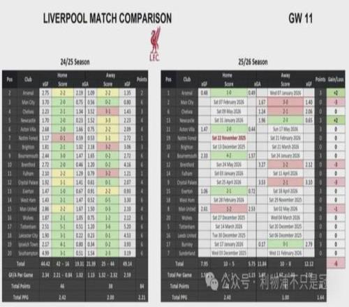而如果把利物浦前11輪比賽結(jié)果,與上賽季同樣對陣結(jié)果對比,利物浦比上賽季少6分。