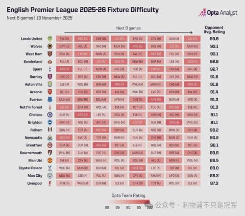 而未來8輪英超賽程,利物浦的難度從正數(shù)第一驟變倒數(shù)第一,也就是最容易,而阿森納的難度排在第8。