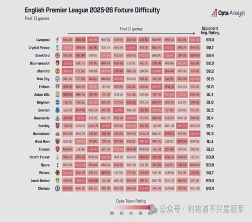 --本賽季英超已經(jīng)進(jìn)行的前11輪比賽,利物浦的賽程難度最大,高居英超第一。阿森納的賽程難度只排到第15,也就是第六容易。