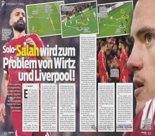 1、德國媒體《體育圖片報》用了兩個整版打通,指責(zé)“獨奏者”薩拉赫是維爾茨和利物浦本賽季表現(xiàn)不佳的“罪魁禍?zhǔn)住薄?/p>