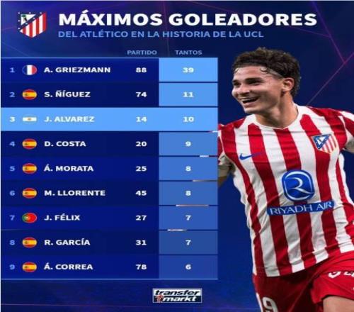 根據(jù)統(tǒng)計, 阿爾瓦雷斯已經(jīng)代表馬競在歐冠中打進(jìn)了10粒進(jìn)球,位列隊史歐冠進(jìn)球榜第三名。