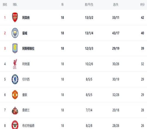 在積分榜上,阿森納的戰(zhàn)績是13勝3平2負,以42分高居榜首。不過,阿森納的領(lǐng)先優(yōu)勢很少,身后的曼城追得很緊。曼城總積分是40分,排名第2,只落后阿森納2分。第3名的阿斯頓維拉的戰(zhàn)績也是極其出色,拿到39分,比阿森納只少3分?,F(xiàn)在的爭冠格局就是三國鼎立,每一輪比賽的結(jié)果都有可能導致榜首的易主。