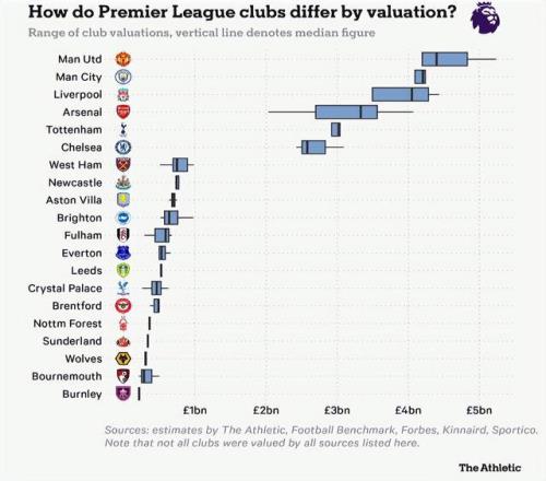 這些身價(jià)區(qū)間的數(shù)據(jù),綜合了TA、足球基準(zhǔn)(Football Benchmark)、福布斯(Forbes)、金奈德咨詢(Kinnaird)以及體育財(cái)經(jīng)網(wǎng)(Sportico)的估值結(jié)果。